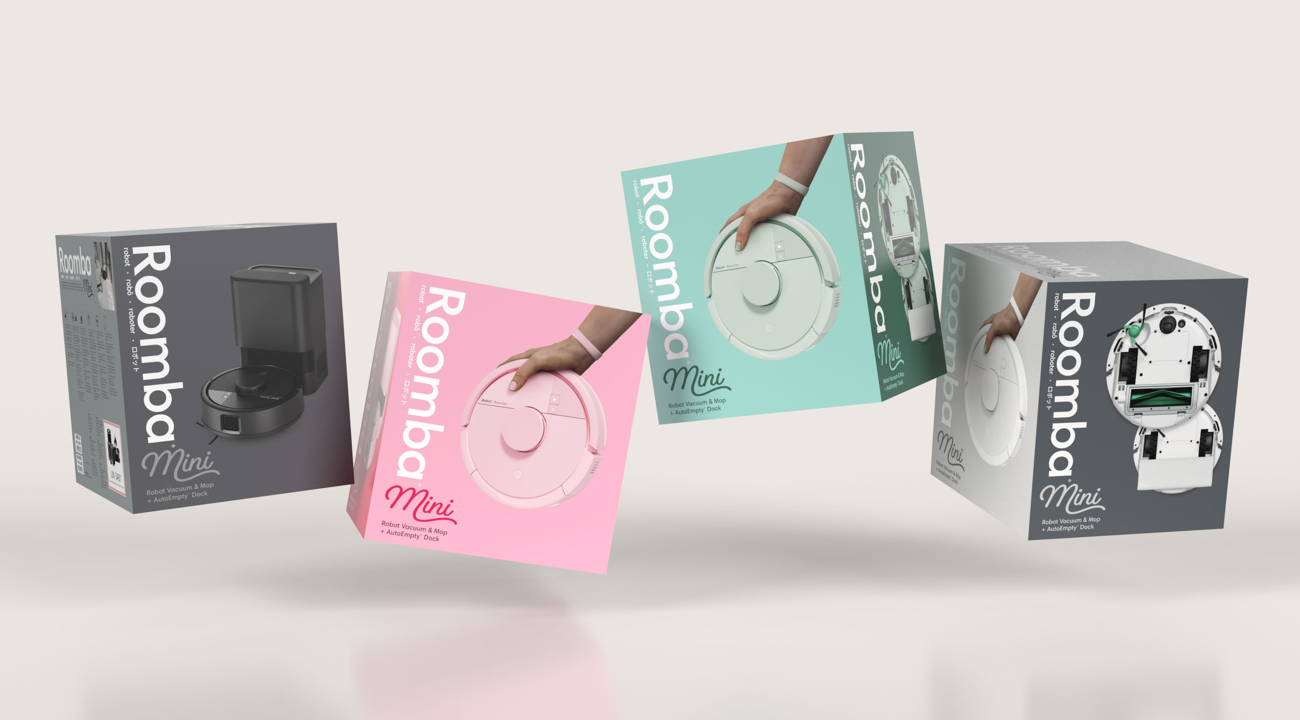 Roomba Mini is iRobot’s newest product line, designed for consumers who want the power of a full-sized Roomba in a smaller, more compact form, without sacrificing performance or personality. Our team was tasked with developing retail graphics and packaging that captured the energy of the Mini line while simplifying product information for quick, confident decision-making. Centered around the idea of “Human Touch,” the design system leans into bold color, warmth, and approachability, using visual comparison cues to highlight the impact of a smaller-sized device. Tone-on-tone robot imagery paired with vibrant, color-blocked backgrounds brings a sense of joy and charm, while maintaining clarity, calm, and strong shelf presence.