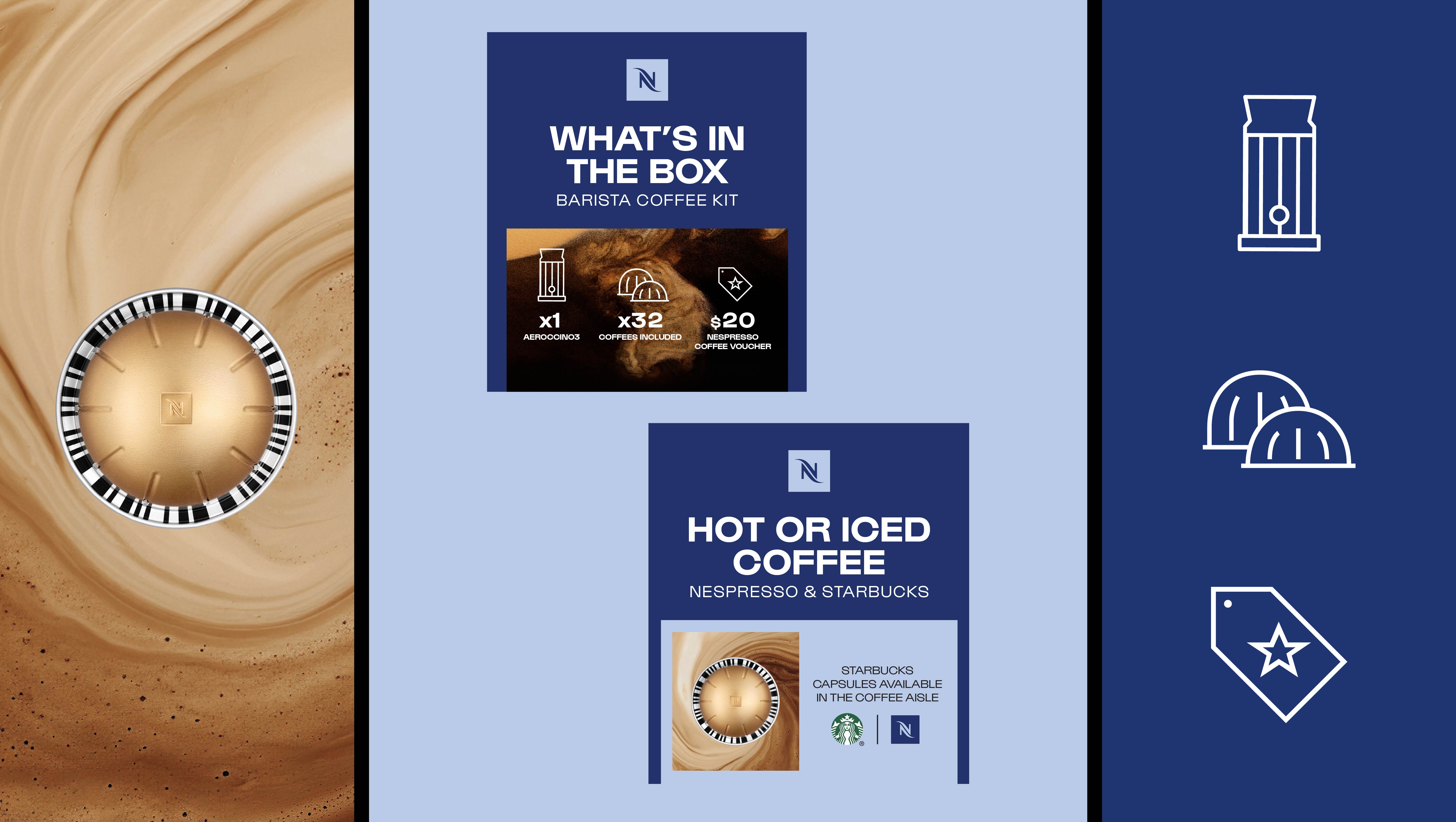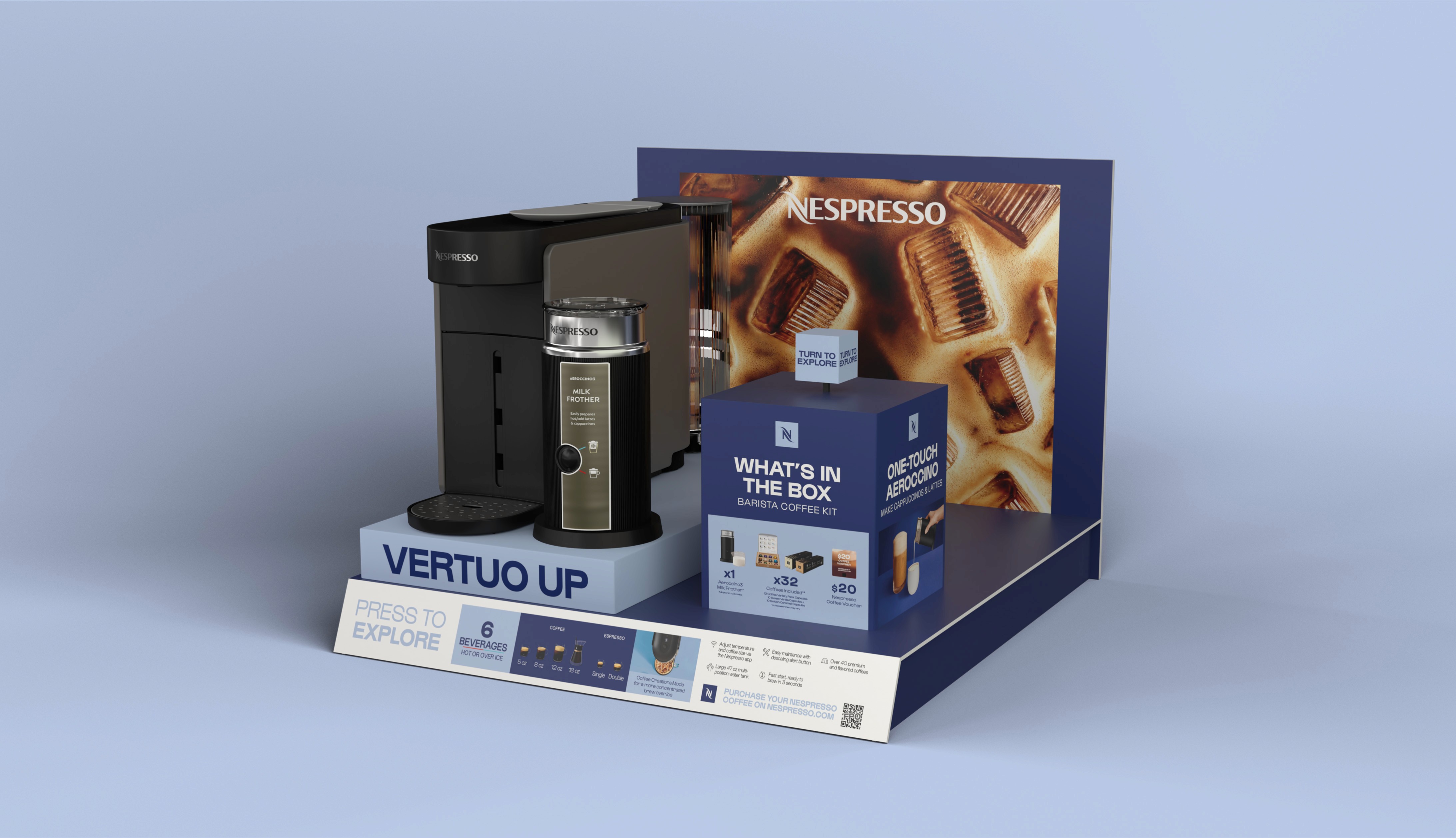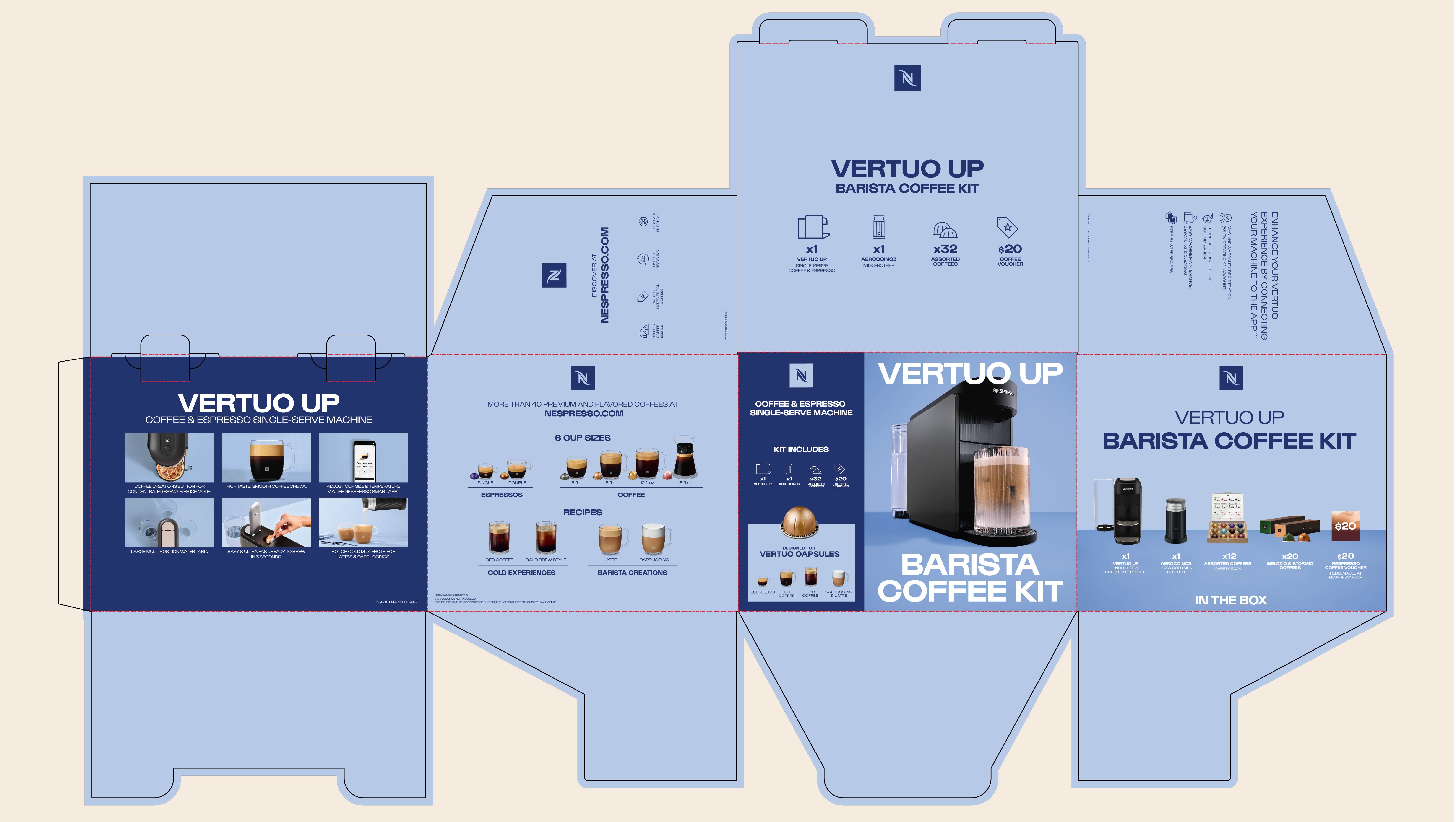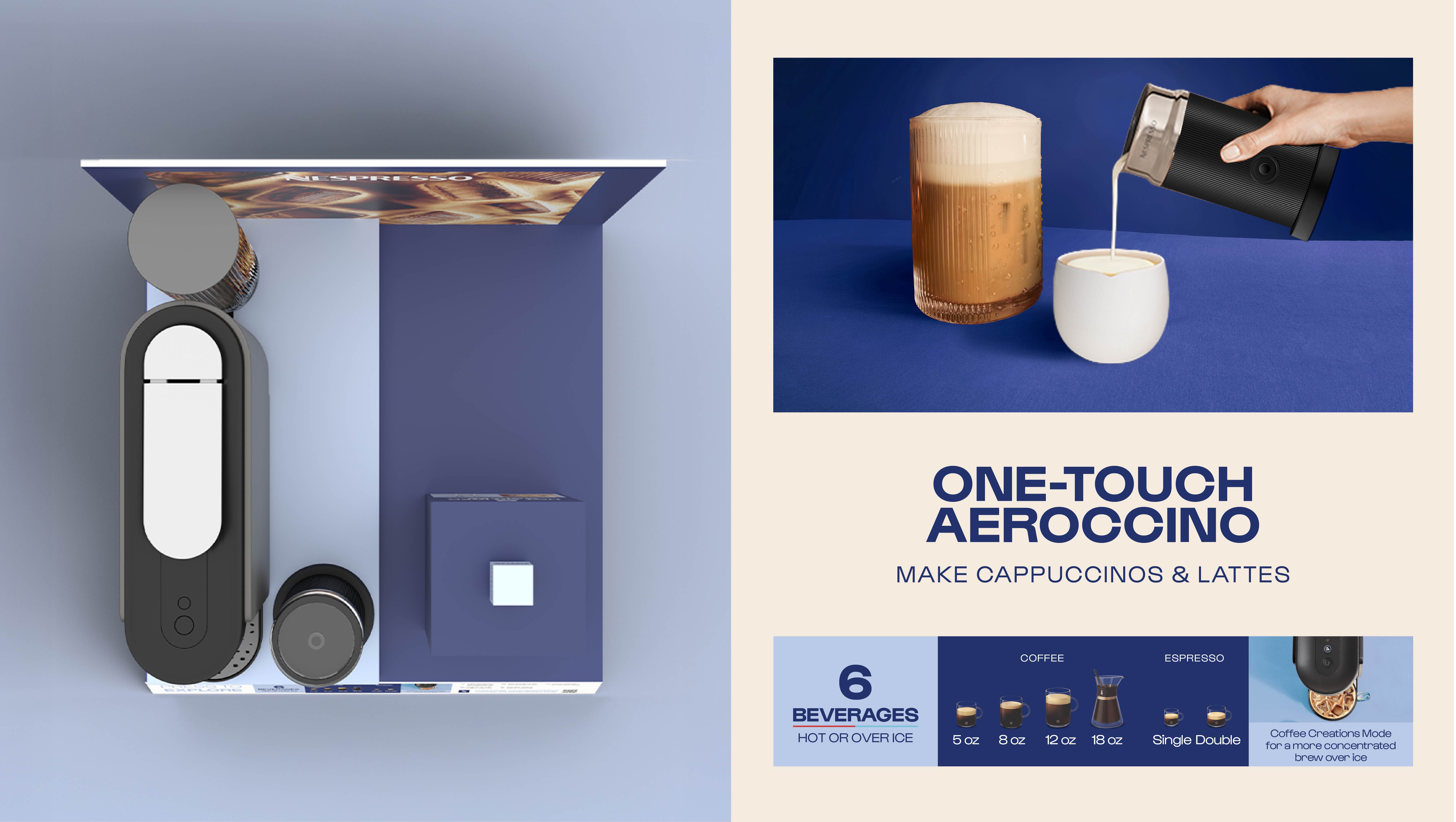 Nespresso’s rebrand focused on evolving the brand to feel more indulgent, energetic, and in tune with Gen Z- ultimately driving stronger appeal and sales with this audience. As part of this effort, we were tasked with designing product displays and packaging for the new Vertuo Up coffee machine. We drew from the square geometry of the Nespresso monogram and paired it with bold, expressive typography to create visuals with real stopping power, while still clearly communicating key product information to shoppers.